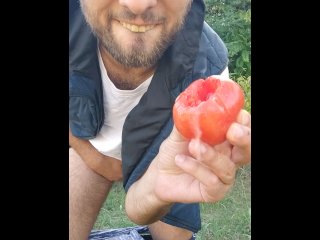Horny Guy Cums Inside Tomato and Very Hot Moaning & Dirty Talk in Outdoor
